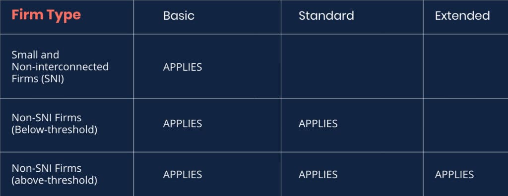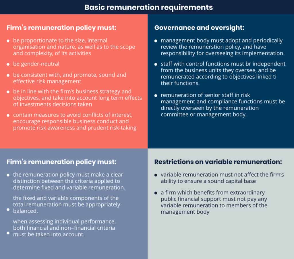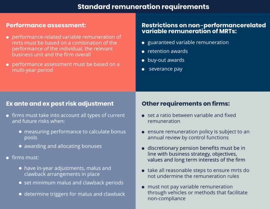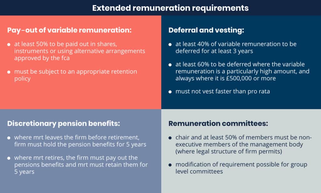 The ‘Basic’, ‘Standard’ and ‘Extended’ remuneration requirements are set out below; most or all of these requirements will be familiar to firms currently subject to a remuneration code: